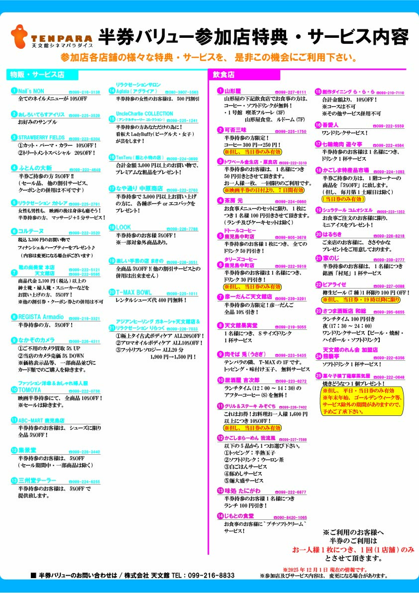 半券のご利用は1回(1店舗)のみとさせていただきます。