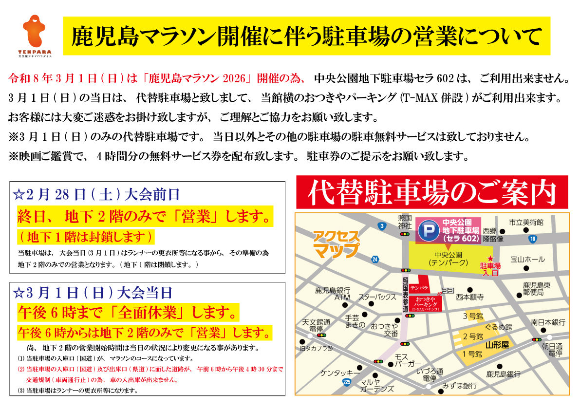 • 【大事なお知らせ】『鹿児島マラソン2026』開催に伴う駐車場の営業について